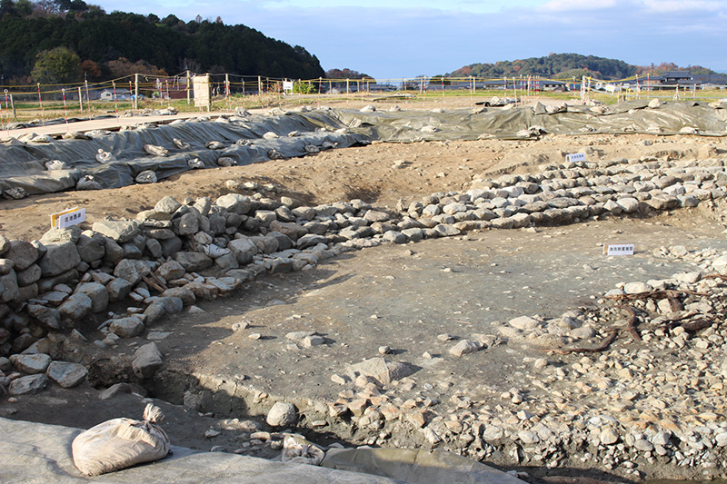 北池北西岸の階段状の石積み